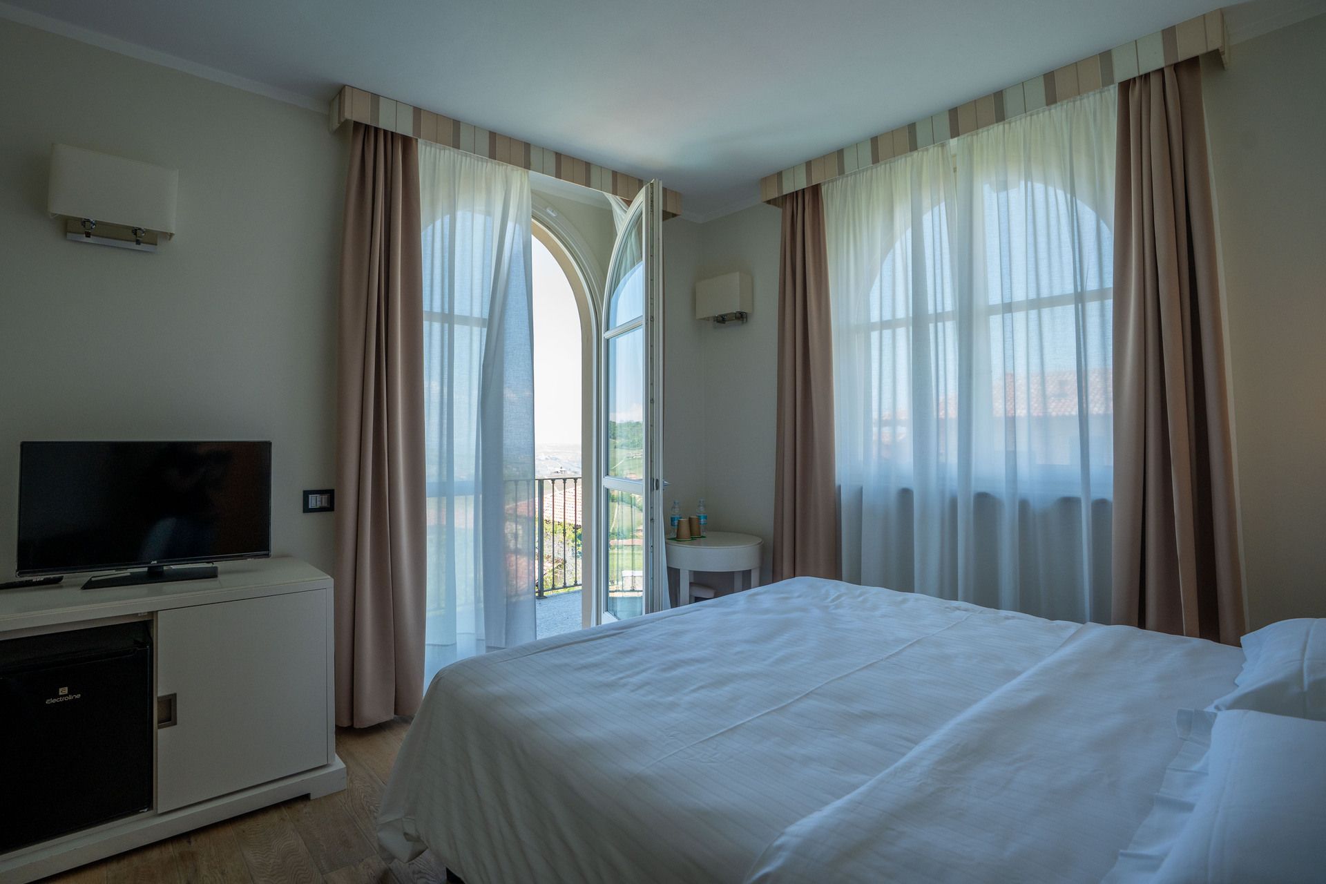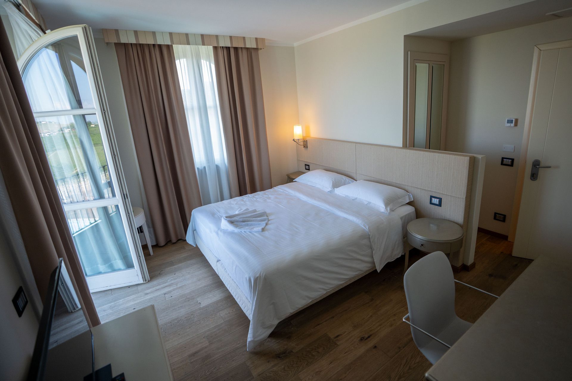 Le tonalità calde e i dettagli curati dell’arredamento creano un’atmosfera accogliente. Una grande finestra lascia entrare luce naturale durante il giorno, con tende oscuranti per un sonno indisturbato. Completano la stanza una scrivania con sedia, una TV a schermo piatto e, in alcune camere, un mini frigo o un bollitore per momenti di relax.